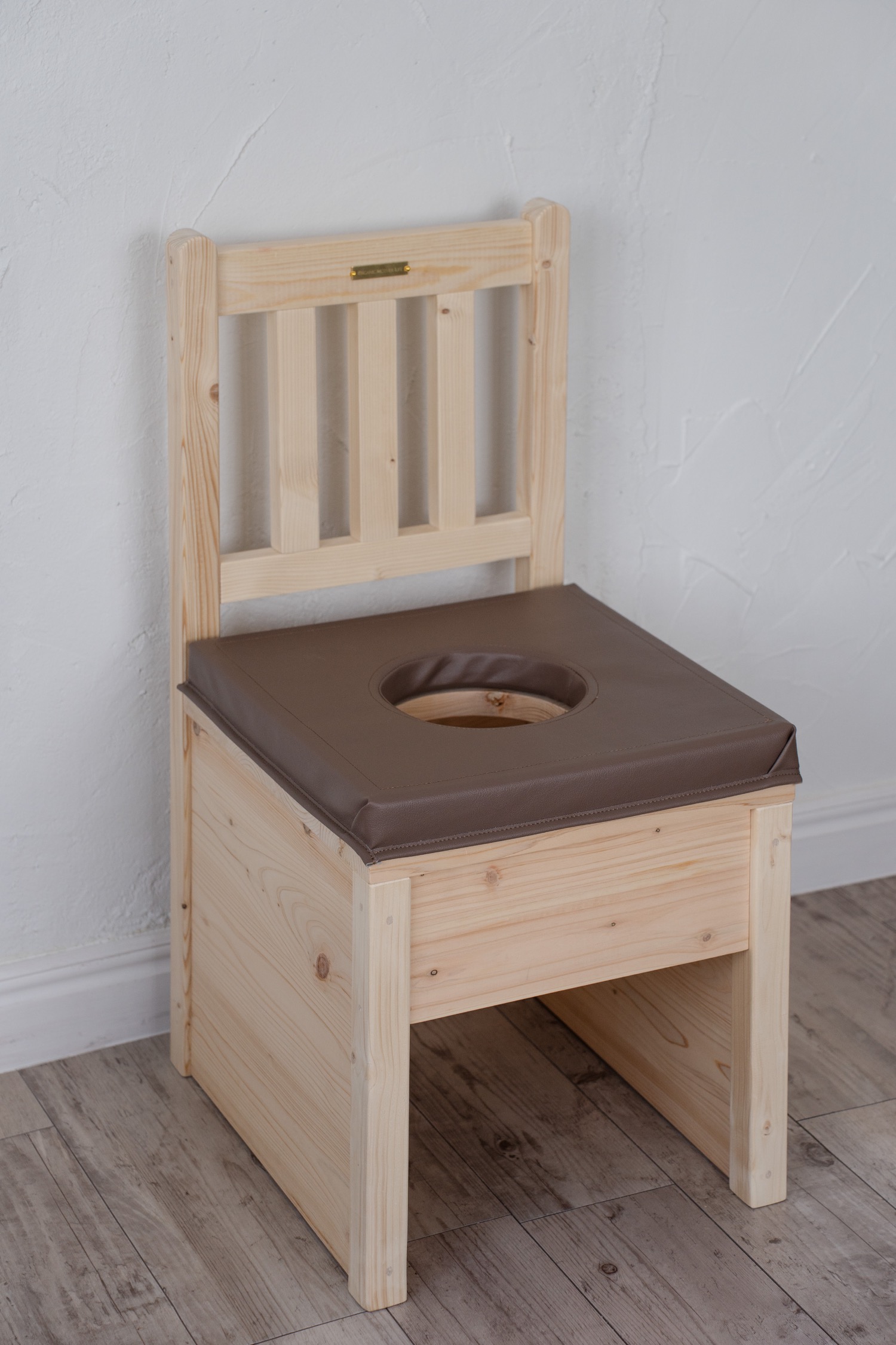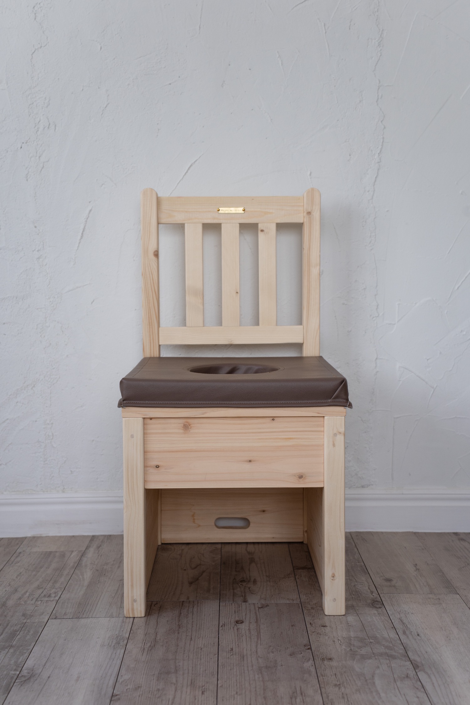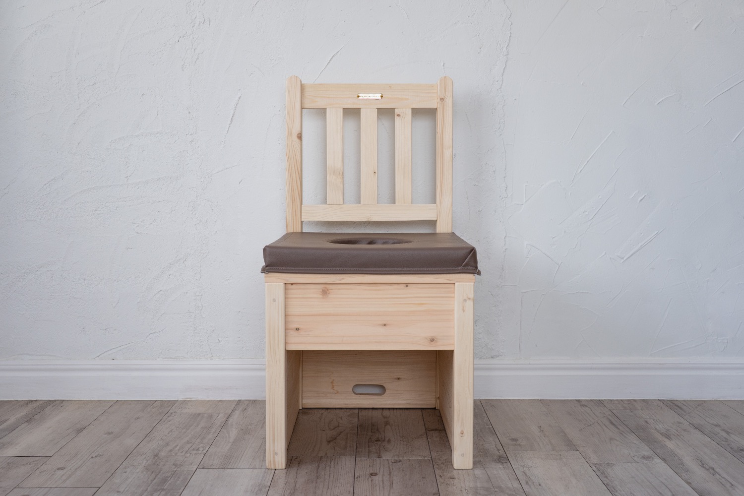 "国産檜(ヒノキ)のよもぎ蒸し椅子"です。有害な塗料を使わない無塗装仕上げで、蒸される間に感じる天然の檜の香りをお楽しみいただけます。クッションも間伐材である檜の木粉を活用したバイオヴィーガンレザーで製作しています。 -